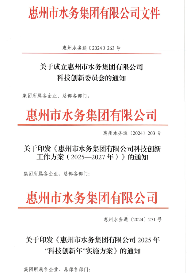 發(fā)布科創(chuàng)工作方案:頒發(fā)《惠州市水務(wù)集團有限公司科技創(chuàng)新工作方案(2025—2027年)》,明確未來三年的科技創(chuàng)新目標和實施路徑。制定《惠州市水務(wù)集團有限公司2025年“科技創(chuàng)新年”實施方案》,有力夯實集團的科技創(chuàng)新基礎(chǔ)。