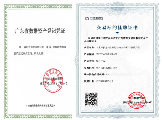 數(shù)據(jù)要素取得突破:首款供水?dāng)?shù)據(jù)產(chǎn)品成功通過廣州數(shù)據(jù)交易所審核,榮獲數(shù)據(jù)資產(chǎn)登記憑證,標志著市供水公司成為廣東省首家完成數(shù)據(jù)產(chǎn)品掛牌交易的供水企業(yè)。此外,該產(chǎn)品也順利完成了數(shù)據(jù)資產(chǎn)財務(wù)入表工作,成為惠州市國資系統(tǒng)第一家利用企業(yè)自有數(shù)據(jù)完成數(shù)據(jù)要素入表的國有企業(yè)。