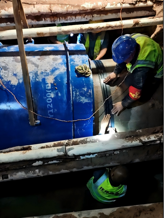 開挖現(xiàn)場變成了一個燈火通明的“地下手術(shù)室”。鉆孔機靜立一旁,搶修隊員們依靠人力,像考古學(xué)家般小心翼翼地在管線夾層中清理出作業(yè)面。泥水混雜,空間逼仄,抽水泵在一旁不知疲倦地轟鳴,將不斷滲出的積水及時排走。每一次鐵鏟的起落,隊員們都格外專注。 泥漿與地下滲水濕透了工裝,但所有人的注意力都高度集中于一點:將那副特制的、重達數(shù)百公斤的“搶修夾”精準(zhǔn)吊裝到位。它如同一個巨大的“血管夾”,在漏點處被穩(wěn)穩(wěn)合攏、緊固,憑借強大的密封力瞬間止住漏水。整個過程,管道壓力平穩(wěn),未影響區(qū)域正常供水。